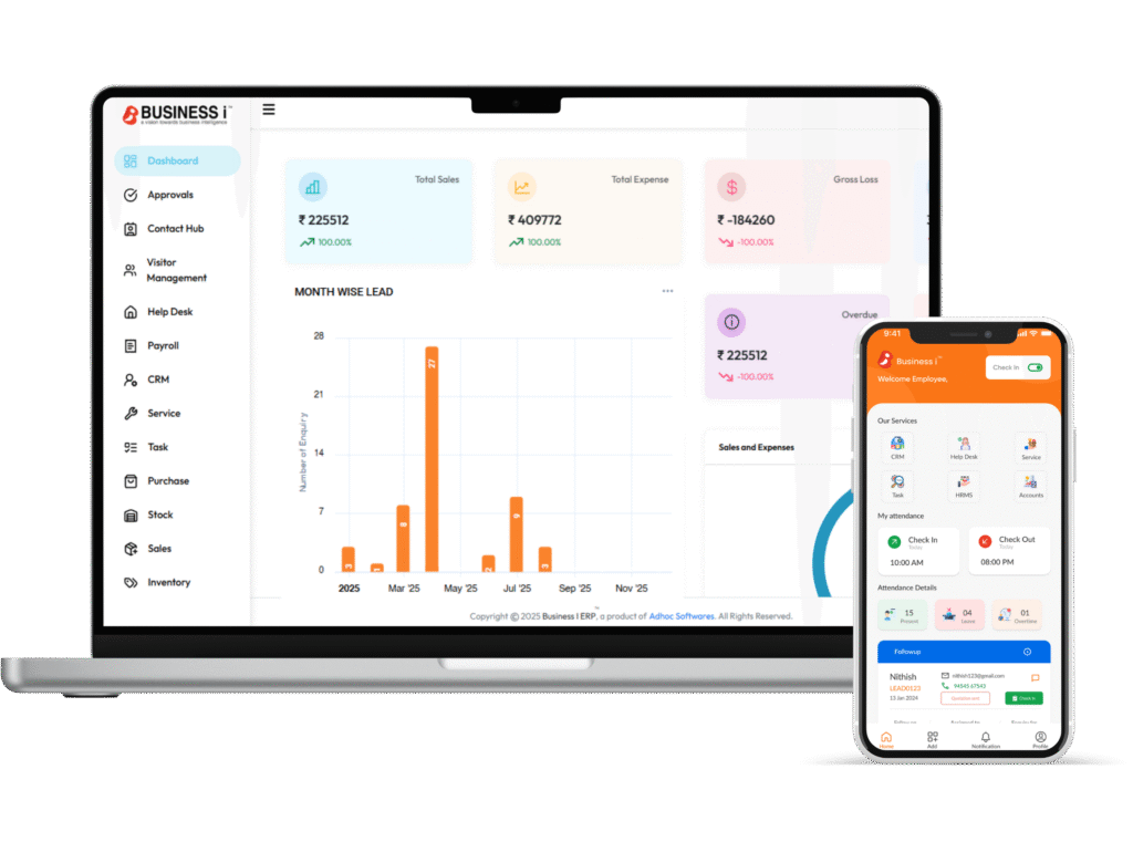 Stay connected to your business wherever you are. Business i ERP is available on both desktop and mobile, giving you full control over operations on the go or at your desk. Approve tasks, track inventory, manage sales, and view reports — all from one seamless platform.