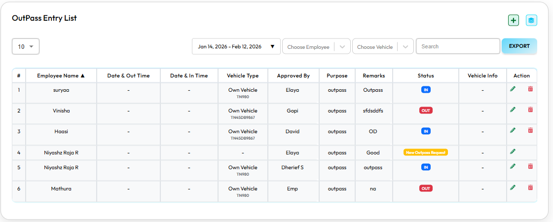 Manage employee and vehicle outpass requests digitally. Maintain accurate in-time and out-time records.